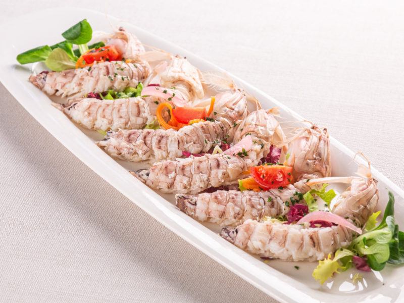 Canocchie Nostrane Pulite dal Carapace cotte al Vapore con Olio e Limone servite sul letto di misticanza