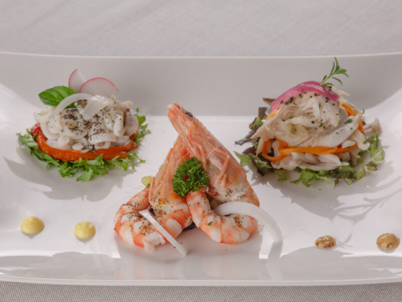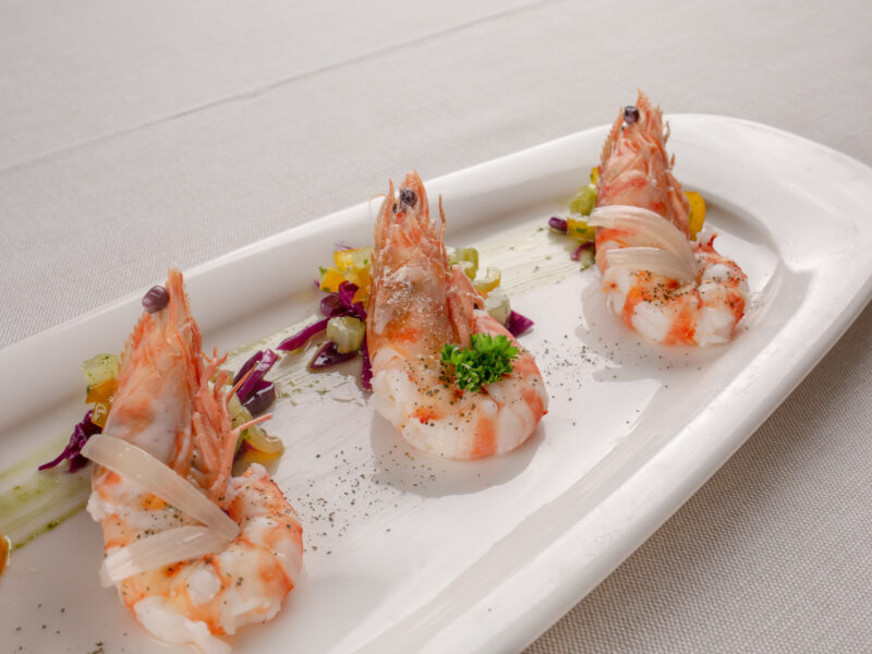 Mazzancolle al Vapore con Sedano, Pomodorini, Cipolla Bianca in Agrodolce, Basilico e Cavolo Viola