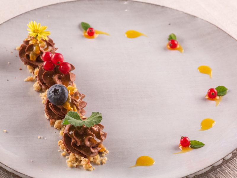 Mascarpone con Crumble alle Nocciole, Salsa di Lamponi e Scaglie di Cioccolato Temperato.