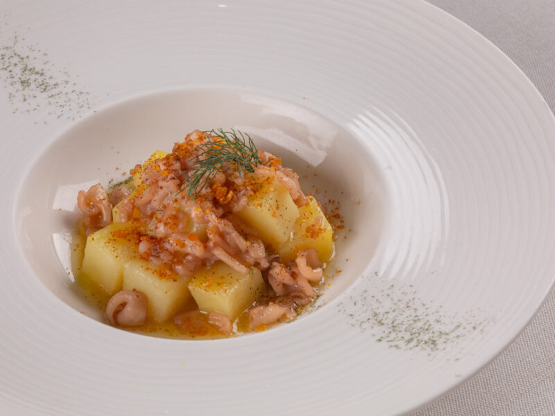 Cubetti di Polenta con Battuto di Calamari, vellutata di Pomodoro Verde, Bottarga Artigianale di Rombo e polvere di